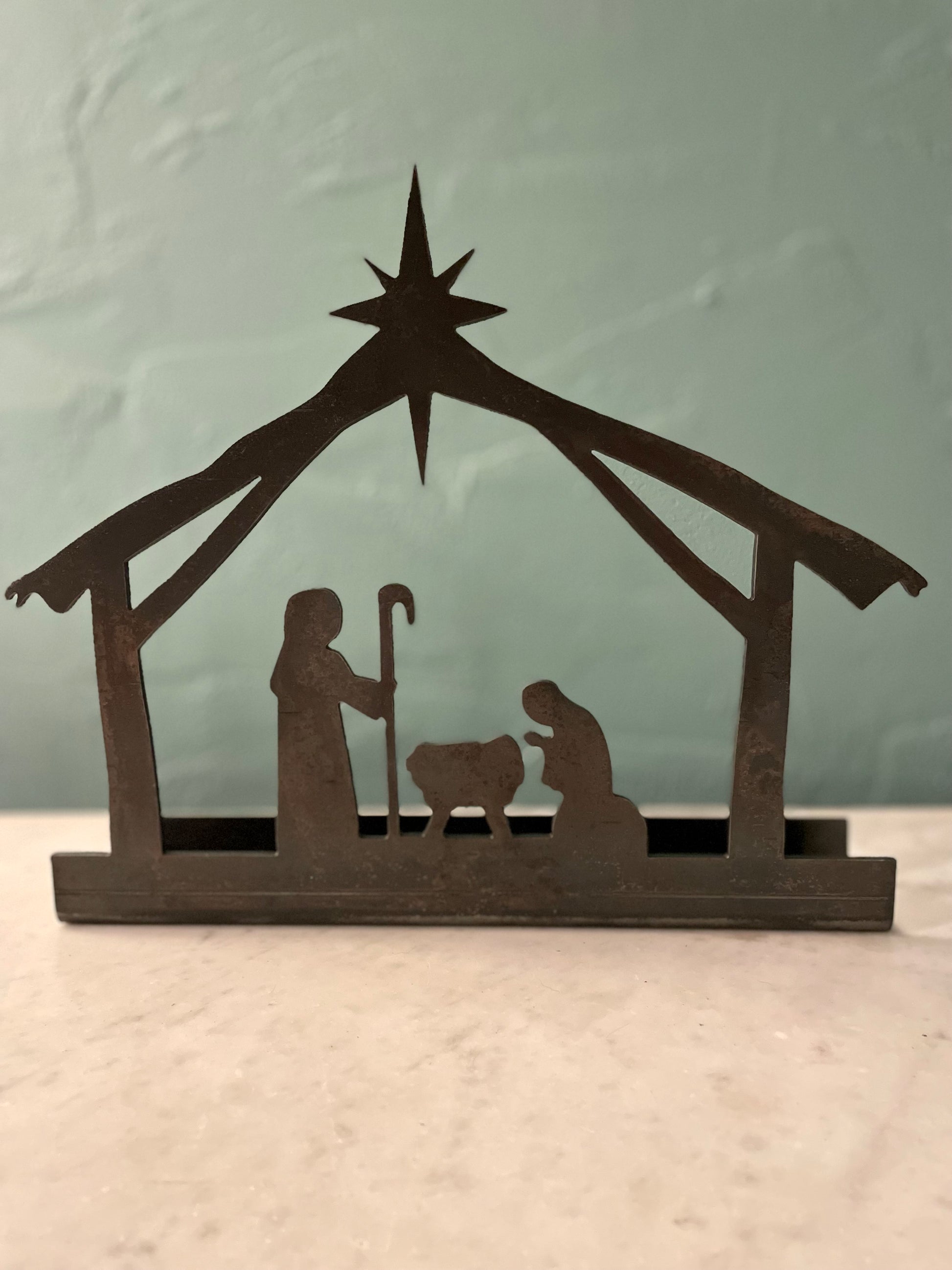 Illuminate the spirit of Christmas with our enchanting tea light nativity This beautifully crafted piece features a serene depiction of the Christmas nativity. Adorned with intricate details that bring the nativity scene to life. This Nativity is cut and bent 1/8th inch steel with a patina finish and sealed with linseed oil. It is designed with a formed tray to securely hold tea lights, casting a warm and inviting glow that enhances the magic of the season. This candle holder is 12 inches long.